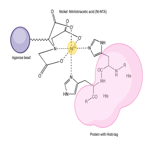 Ni-NTA-based affinity chromatography is one of the most widely used affinity chromatography techniques to purify proteins recombinantly produced with a hexahistidine tag or naturally rich in histidine amino acids. This is a special type of affinity chromatography called Immobilized Metal Affinity Chromatography (or IMAC), in which nickel is covalently coupled to agarose using the chemical compound nitrilotriacetic acid (NTA). NTA is a hexadentate ligand that coordinates Ni2+ ion and His residues in the analyte protein (natural or recombinantly synthesized with a His6 ¬tag) bind to this coordination complex (Figure 2). This binding is attributed to the intrinsic property of His to bind to metals like Ni and Co.