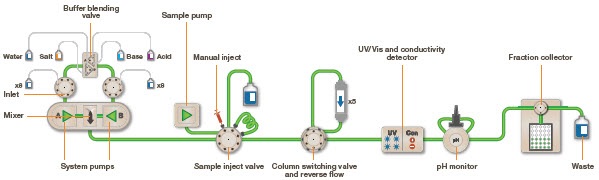 Figure 4: Schematic diagram of the flow path in a Fast Protein Liquid Chromatography (FPLC) system used for automated protein purification