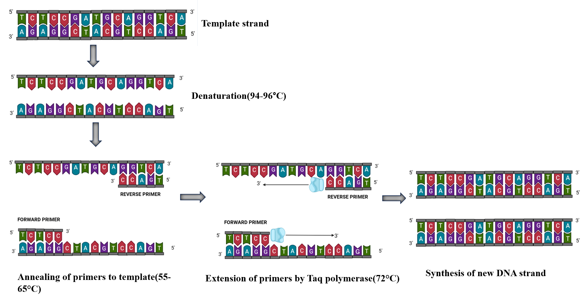 - Annealing (55- 65°C): In this step, the PCR reaction temperature is lowered to allow binding of the primers to the target DNA sequence of the template. Incubation time of 0.5–2 minutes is sufficient for primer annealing. The annealing temperature is determined by calculating the melting temperature (Tm) of the selected primers for PCR amplification.