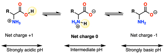 Figure 3: A typical amino acid with neutral R-group transitions from positively charged to a zwitterion and then to a negatively charged moiety as pH increases