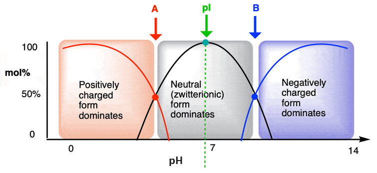 Figure 5: The pI lies between the points A and B where the concentration of an acid is the same as that of its conjugate base