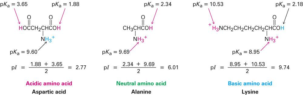 To calculate the pI of a neutral amino acid, an average of the pKa1 and pKa2 values are taken. However, to find the pI of a triprotic acid, the average of the pKa values that are closest to the pH at which the amino acid assumes zero net charge is used (Figure 6).