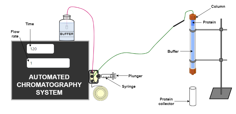 - Sample injection and fraction collection : Samples can be applied directly to the column via a chromatography system, a peristaltic pump, or a syringe. Samples are then eluted isocratically using a single buffer on the basis of their decreasing molecular weight. After sample injection, the entire separation takes place as one column volume of buffer (equivalent to the volume of the packed bed) passes through the column and the separate fractions containing the different-sized proteins are collected. Maximum resolution is obtained with a long column and a low flow rate.