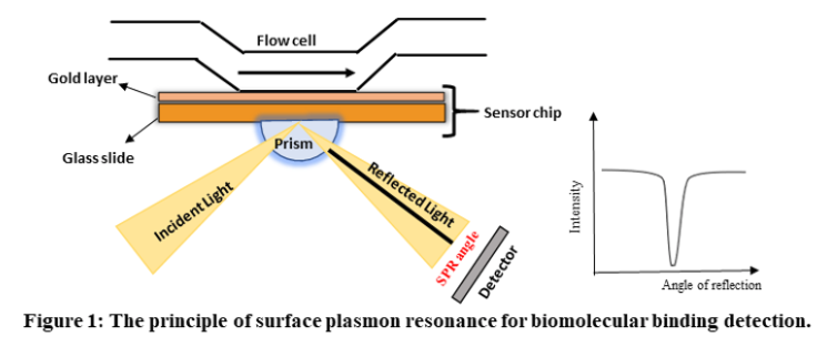 Surface Plasmon Resonance (SPR) is a phenomenon that can be observed in thin conducting films at an interface between media of different refractive index. In SPR systems, the media are the glass of the sensor chip and the sample solution, and the conducting film is a thin layer of gold on the sensor chip surface. SPR is a physical process that can occur when plane-polarized light hits a thin metal film under total internal reflection conditions. When a light beam hits a half-circular prism, the light is bent towards the plane of interface, when it is passing from a denser medium to a less dense one. Changing the incidence angle (Θ) changes the out-coming light until it reaches a critical angle. At this point, all the incoming light reflects within the circular prism. This is called total internal reflection (TIR). The surface is coated with a thin film of a noble metal, usually gold. Gold is used in sensor chips because it combines favourable SPR characteristics with stability and a high level of inertness in biomolecular interaction contexts. At a certain combination of angle of incidence and energy (wavelength), the incident light excites plasmons (electron charge density waves) in the gold film. As a result, a characteristic absorption of energy via the evanescent wave field occurs and SPR is seen as a drop in the intensity of the reflected light as shown in figure 1.