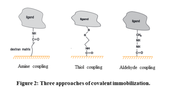 - Covalent immobilization: Covalent coupling is the preferred immobilization method due to high coupling yields and stable covalent bonds between ligand and sensor chip coating. The carboxymethyl (CM) dextran on Sensor Chip CM5, other CM-series chips and Sensor Chip L1, as well as the carboxyl groups directly attached to the surface of Sensor Chip C1, provide a solid foundation for a range of covalent immobilization chemistries. The three most common methods employed are amine coupling, thiol coupling, and aldehyde coupling. Amine coupling relies on the activation of the surface with 1-ethyl-3-(3-dimethylaminopropyl)-carbodiimide (EDC) and N-hydroxysuccinimide (NHS) to exploit primary amine groups on the ligand. Thiol coupling uses thiol-disulfide exchange between thiol groups and active disulfides introduced on either the ligand or the surface matrix. Aldehyde coupling employs the reaction between hydrazine or carbohydrazide groups introduced on the surface and aldehyde groups obtained by oxidation of carbohydrates in the ligand.