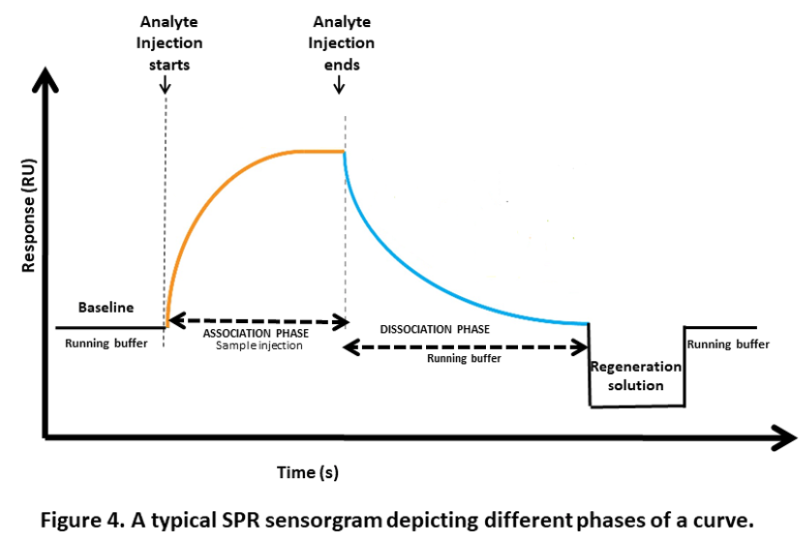 The final step is the regeneration phase, where the regeneration solution, such as a low-pH buffer, is injected into the sensor to remove any remaining bound target compounds. This step ensures that the sensor is cleaned and ready for the next experiment. The most frequent regeneration method used, is to inject a low pH-buffer such as 10 mM Glycine pH 1.5–2. This works probably because most proteins become partly unfolded and positively charged at low pH. The protein binding sites will repel each other and the unfolding will bring the molecules further apart.